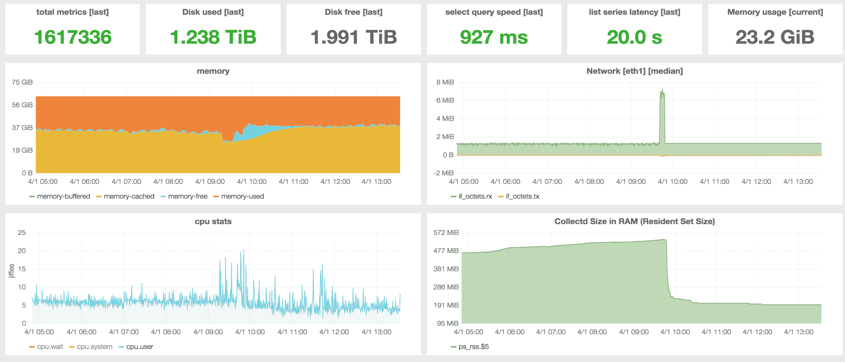 At the moment metrics are being sent from around 150 clients with a 10 seconds interval. InfluxDB is receiving 10K values/sec at a rate of 1.2MB/sec and it has been storing data from more than 1.6 million series during the last 3 months. Some series are no longer in use but they have not been removed because deleting values is still very expensive in InfluxDB and you better don’t do it.
