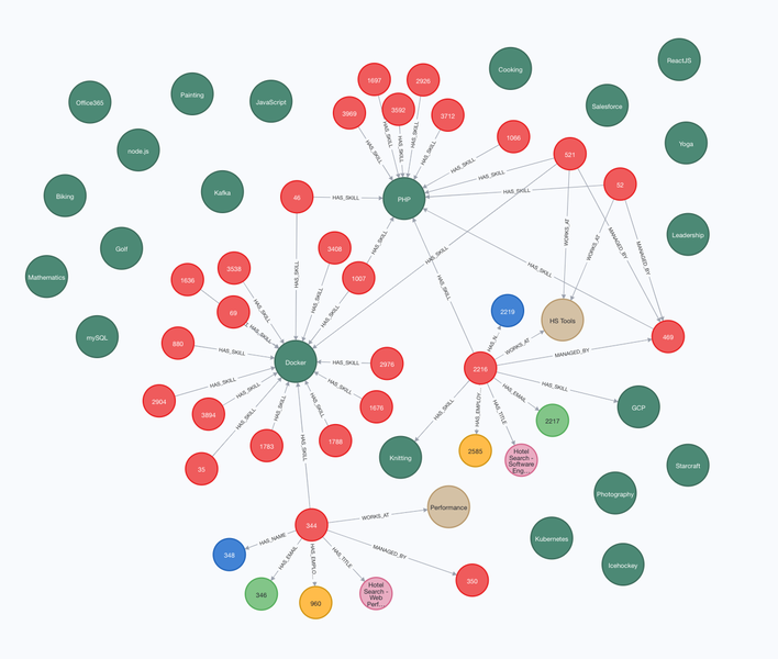 Timmo Schulte had the idea to create a graph from the skills of our employees using Neo4j and a web visualisation. Talents can tag themselves with skills that will be searchable by everyone.