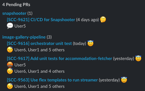 This independent script will scan the open pull requests of repositories a team owns and send a report to your team Slack channel. No need to run around tens of repositories to see which PRs to review.